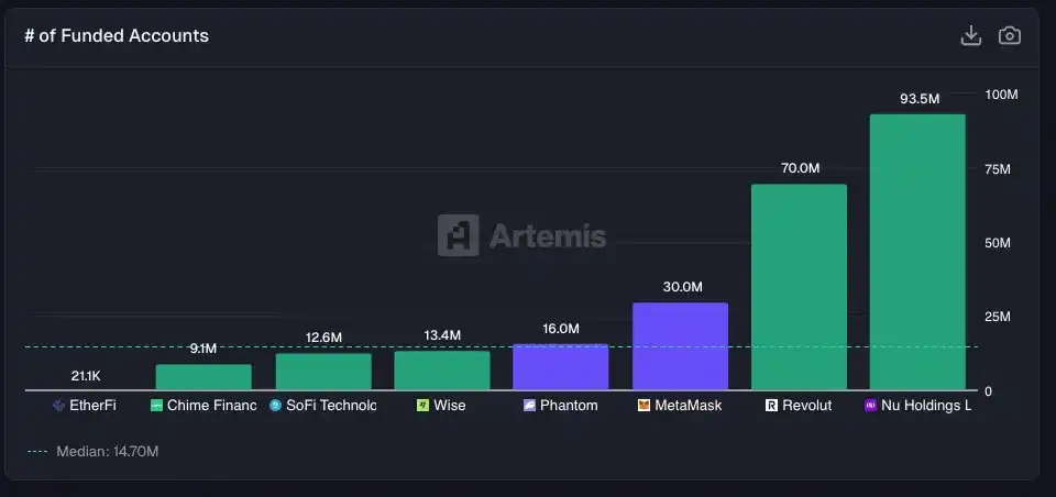 按應用劃分的月活躍使用者(MAU)。Nu、Wise、SoFi、Chime 的 MAU 資料來自公司披露檔案;EtherFi 的資料來自 Artemis;Phantom、MetaMask、Revolut 的資料則分別來自其公開來源。