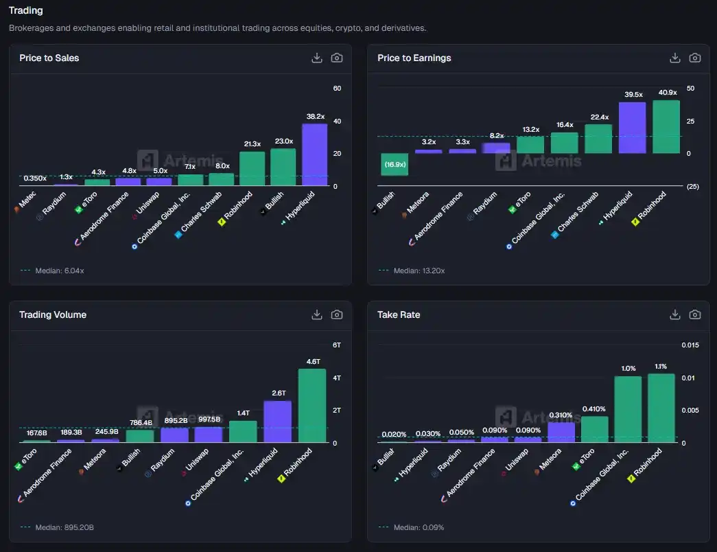 唯一的例外是 Hyperliquid。由於其規模的爆發式增長,Hyperliquid 的表現幾乎與 Robinhood 同步,在同一時期實現了接近的漲幅。