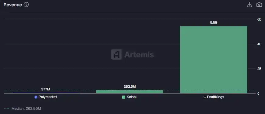預測市場的收入對比。Polymarket 的收入資料來自 Artemis;Kalshi 的收入來自公開資料;DraftKings 的 LTM 收入來自公司財報。
