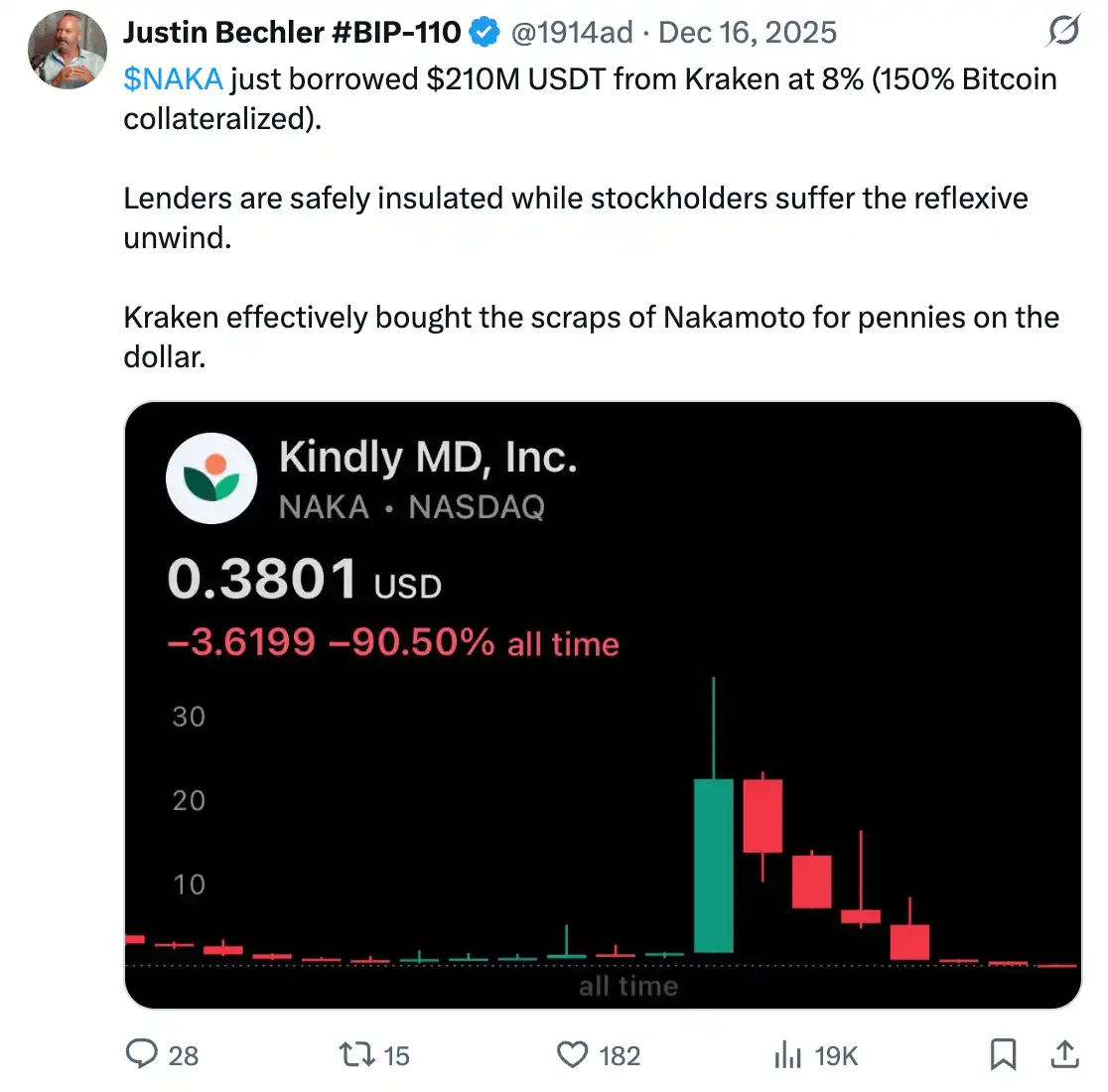 算算這筆帳:貸方擁有價值 3.15 億美元的比特幣作為 2.1 億美元貸款的擔保。如果 NAKA 股價歸零,Kraken 拿走抵押品。如果比特幣下跌 33%,Kraken 依然毫髮無損。在這場大戲的每一個階段,貸方都受到了嚴密保護,而普通股股東卻承受了反身性崩盤的全部衝擊。