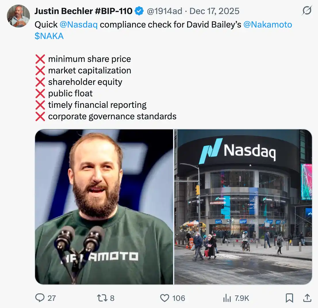 12 月 10 日,納斯達克通知 Nakamoto,因股價連續 30 個工作日低於 1 美元,面臨退市風險。公司必須在 2026 年 6 月 8 日之前重新合規,即連續 10 個交易日收盤價高於 1 美元。