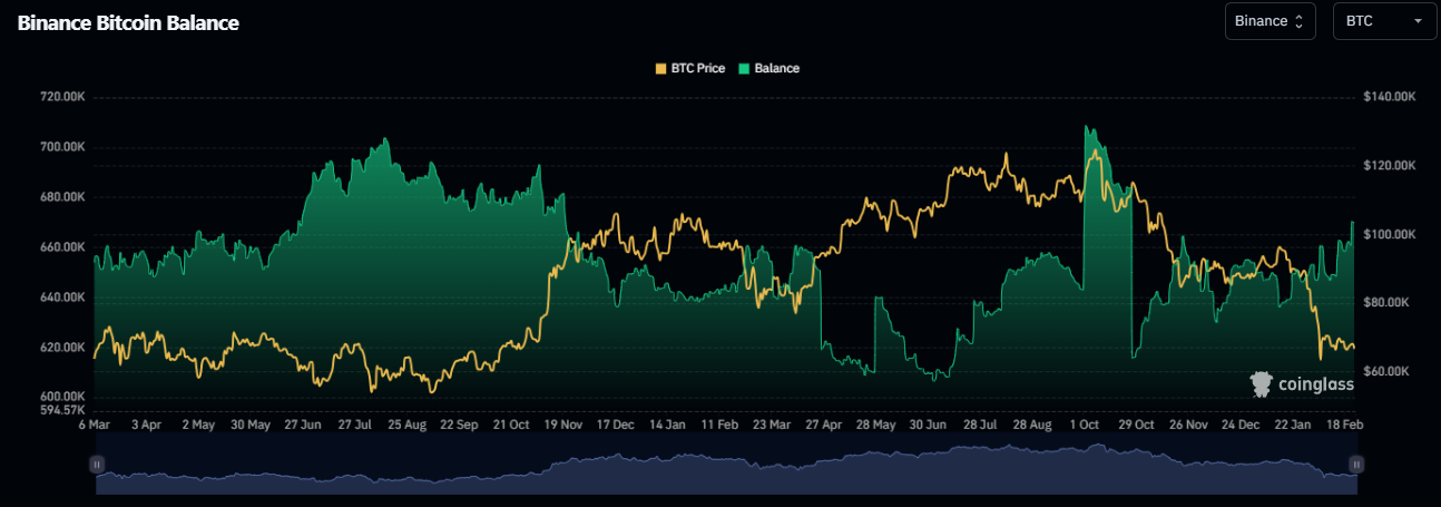 據 Coinglass 數據顯示,截至週日,與幣安相關錢包中的比特幣總量達 676,834 枚,約合 445 億美元。相較於 2024 年 11 月的多月低點 618,782 枚,增幅約 9.3%。