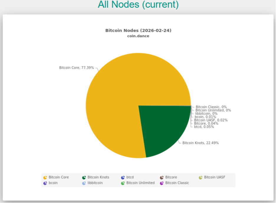 随着争议发酵,Bitcoin Knots的市场份额已飙升至22.49%,而全节点客户端Bitcoin Core的份额大幅下滑至77.39%。这一趋势表明, 相当一部分节点正在通过更换客户端来表达对数据限制的支持。