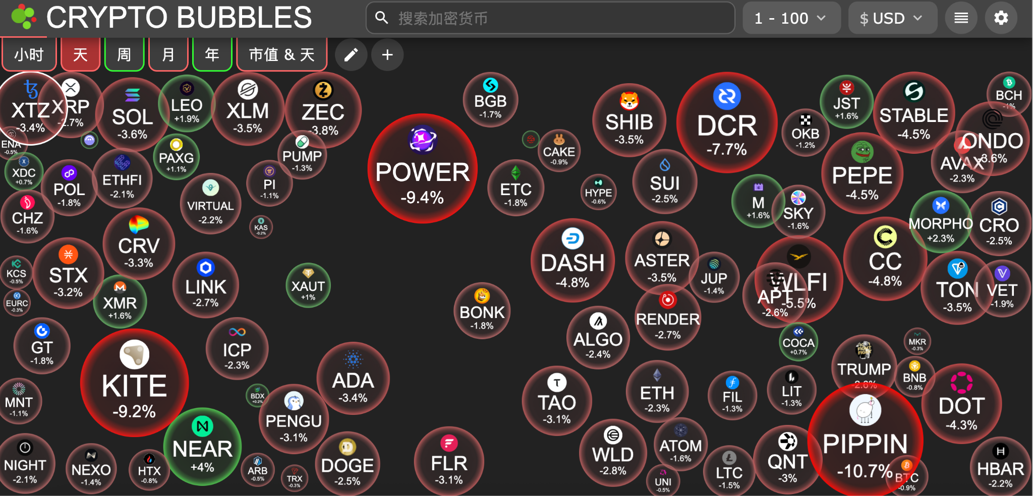 今日市值前100币种最大跌幅:Power Protocol 跌9.4%、Decred 跌7.7%、Stable 跌10.7%、Internet Computer 跌9.2%、MemeCore 跌5.5%。