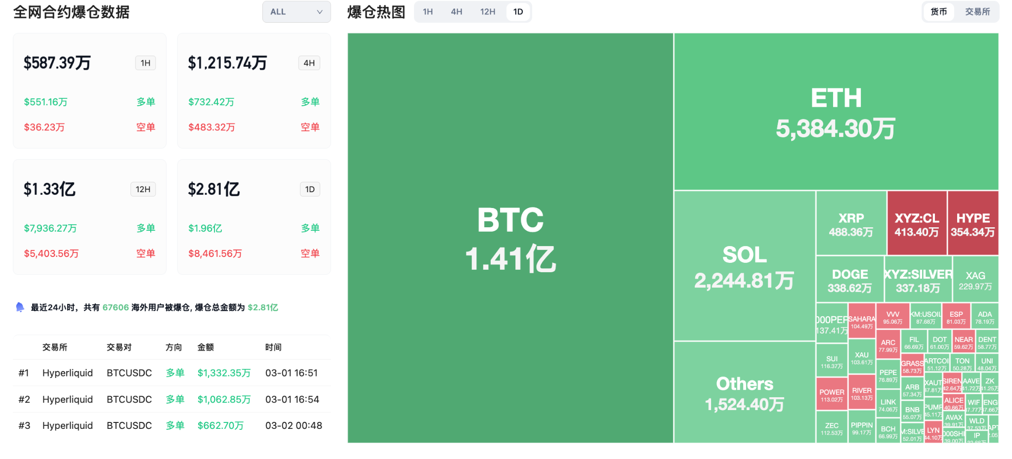 全球共67606人被爆仓,爆仓总金额为2.81亿美元,其中BTC爆仓1.41亿美元、ETH爆仓5384万美元、SOL爆仓2244万美元。
