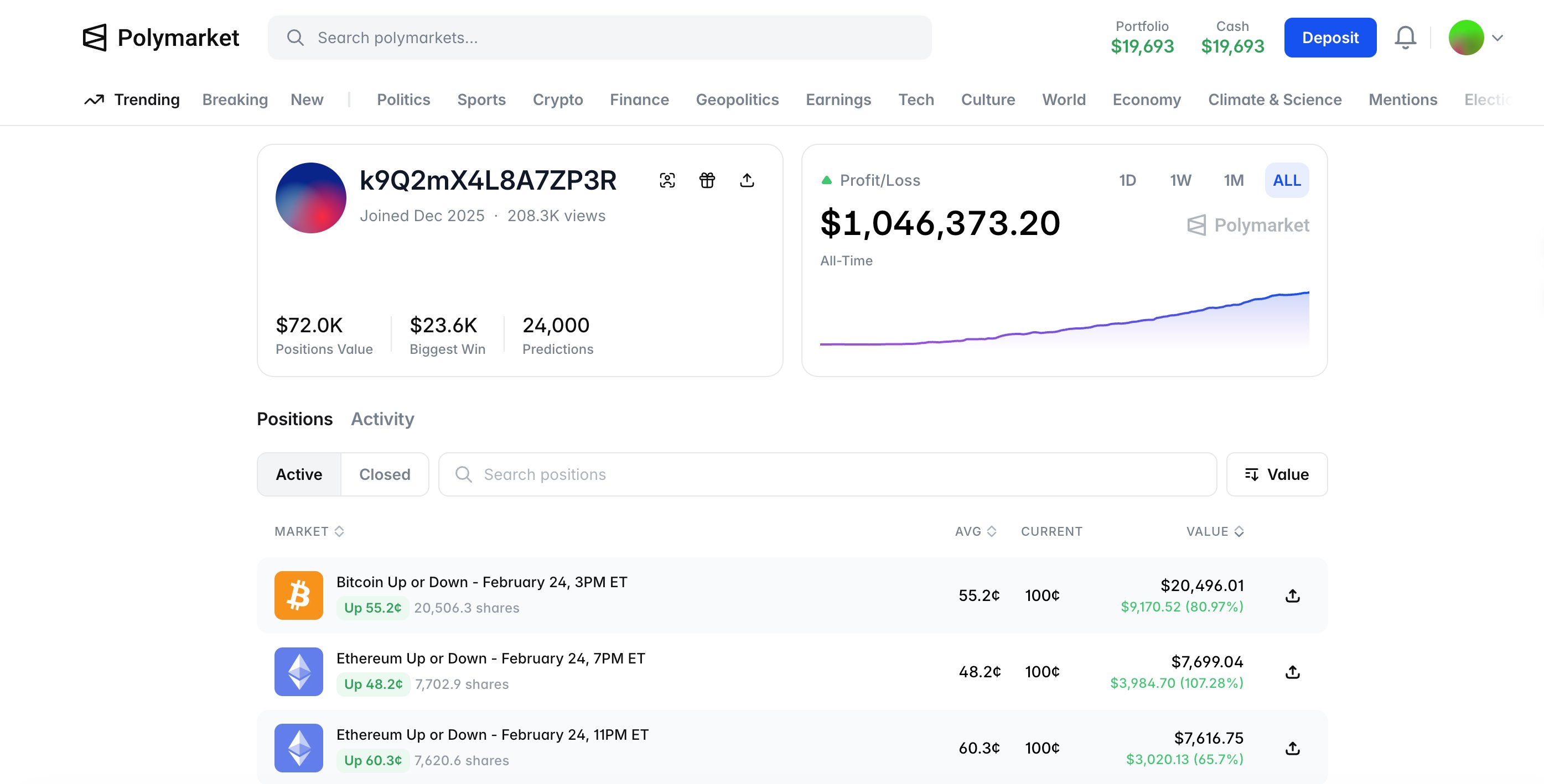 账户 k9Q2mX4L8A7ZP3R :总盈利超过 $1,046,373.20 ,参与了 24,000 次预测 。