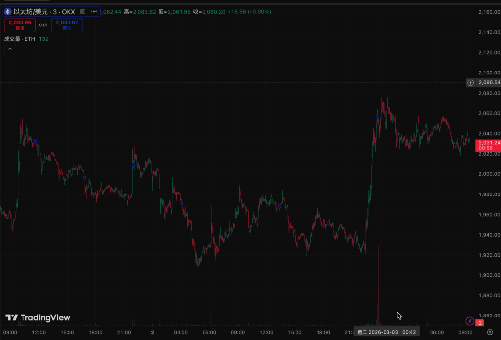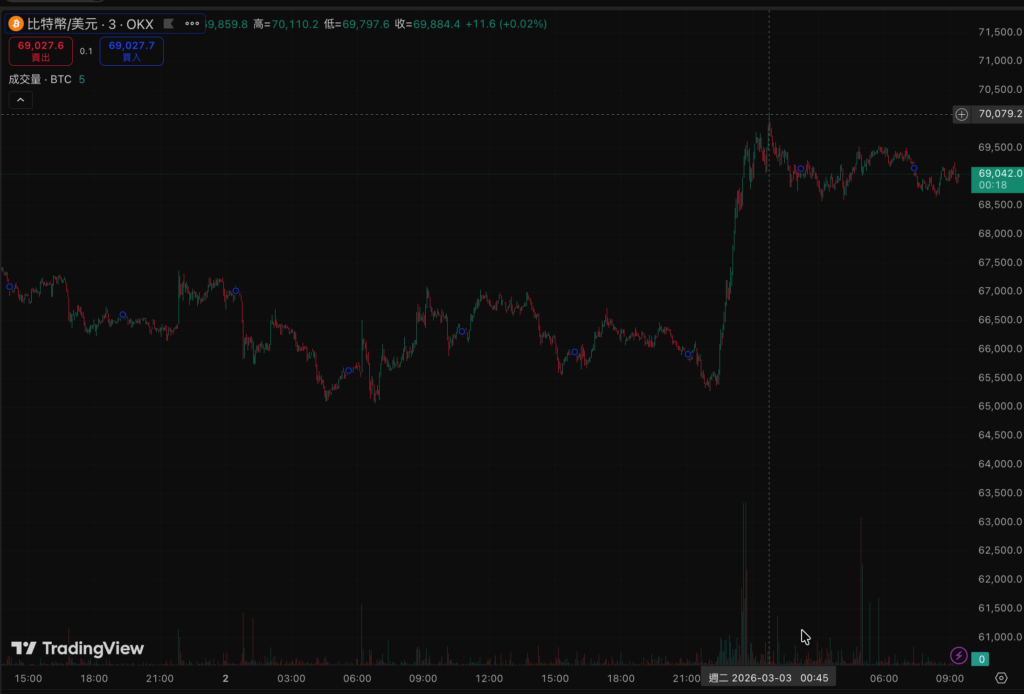 比 特幣自週末晚間迎來一波猛烈上漲,從 $65,000 水位一路攀升,半夜時分一度插針 $70,110 ,隨後開始回落,目前交投於 $68,500 附近;以太坊(ETH)同步從 $1,922 起漲,一度衝破 $2,080 大關,現報約 $2,026。儘管漲幅未能完全守住,但這波由地緣政治引爆的反彈,仍被市場視為熊市中的重要「築底訊號」。
