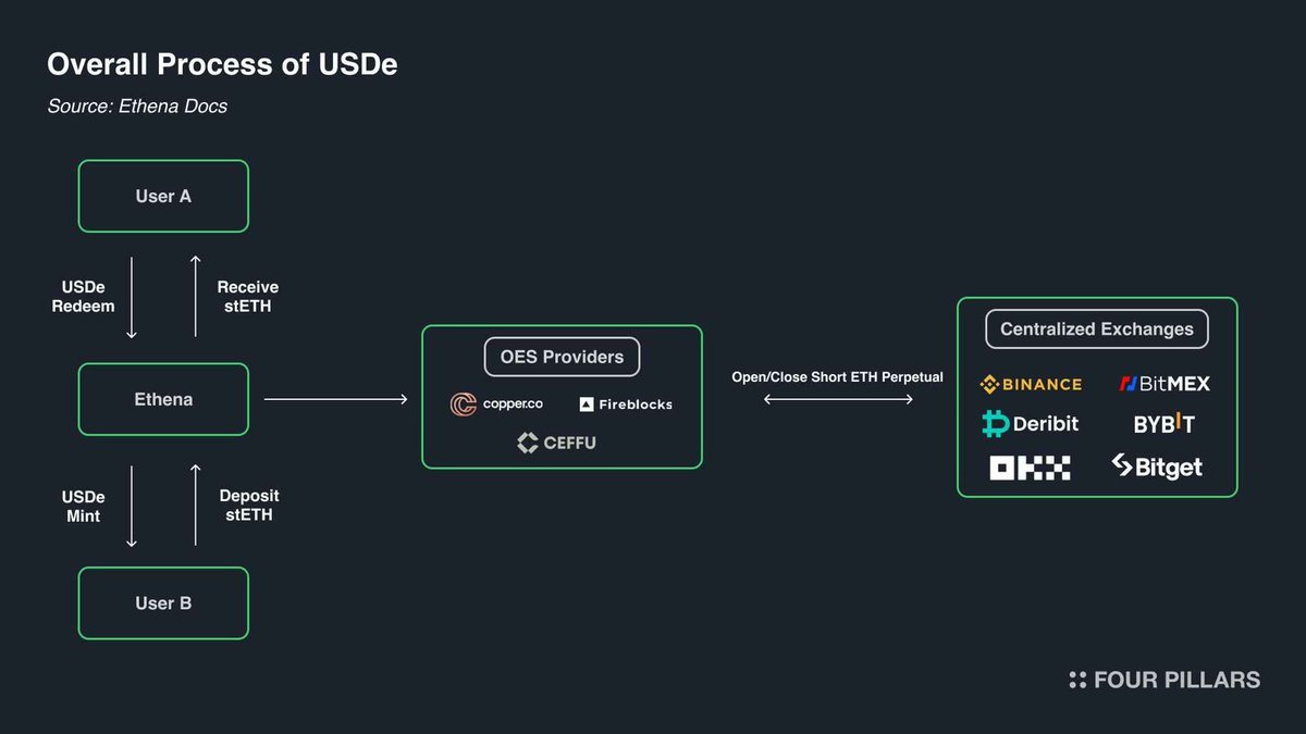 特别是 Ethena,提供了一个观察加密衍生品市场的独特窗口。如下图所示, Ethena 实现了“加密套利交易”。 该策略很简单:当加密交易者做多时,Ethena 作为其对手方进行做空。然后,Ethena 会确保购买与其空头头寸完全等量的资产。