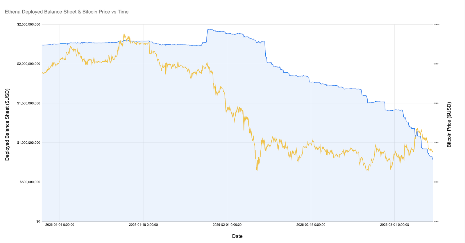 特别是,在比特币价格暴跌至 6 万美元的那次市场崩盘期间,Ethena 的部署资金曾超过 20 亿美元。而自 2026 年 2 月 8 日(一个月前)以来,其部署资金已暴跌了惊人的 60%。