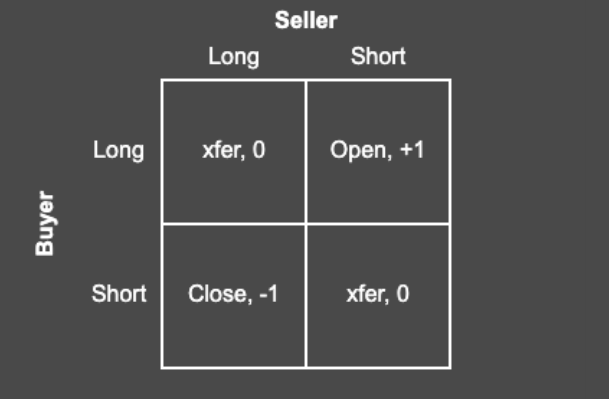 每笔交易都有买家和卖家。当合约的买方和卖方都做多或都做空时,交易所只需将合约的所有权从一方转移到另一方即可。这种转移不会创建或销毁任何合约。当买方做多而卖方做空时,必须创建一个新合约,买方持有多头头寸,卖方持有空头头寸,未平仓合约量增加 1。另一方面,如果卖家平多而买家平空,交易所可以直接解除买方和卖方与合约的关联,并删除新释放的合约,未平仓合约量减少 1。