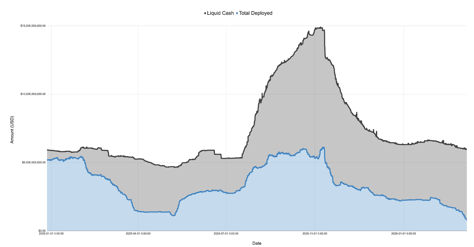 2025 年,在 1 月 $TRUMP 代币推出后,市场情绪急剧转向风险规避,并一直下滑到 4 月的关税谈判和最终的“解放日”。在此期间,Ethena 的已部署资本从超过 50 亿美元暴跌至仅 11.08 亿美元,跌幅超过 75%。