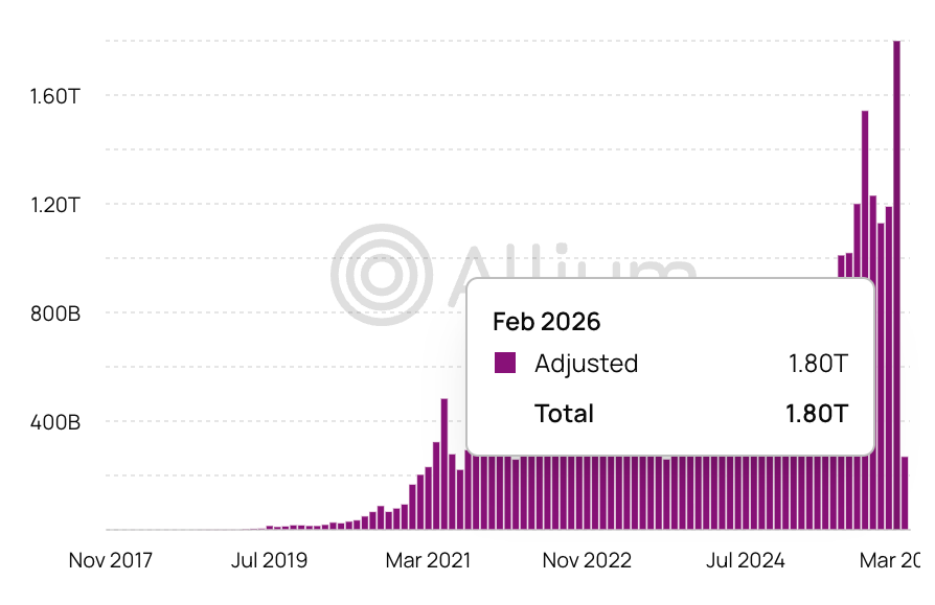 2月份,稳定币赛道见证了一个反超时刻。Allium数据显示,全市场月度转账量达到1.8万亿美元,刷新了历史最高纪录。