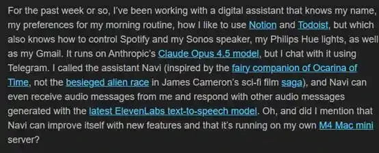「过去一周左右,我一直在使用一个数字助手,它知道我的名字,了解我早晨的日常习惯,知道我喜欢如何使用 Notion 和 Todoist,同时它还能控制 Spotify 和我的 Sonos 音箱、飞利浦 Hue 灯,以及我的 Gmail。它基于 Anthropic 的 Claude Opus 4.5 模型运行,但我通过 Telegram 与它交流。我给这个助手命名为 Navi,Navi 甚至能接收我的音频消息,并使用最新的 ElevenLabs 文本转语音模型生成其他音频消息进行回应。哦,对了,我还没提到 Navi 可以通过新功能进行自我改进,而且它正在我自己的 M4 Mac Mini 服务器上运行?」