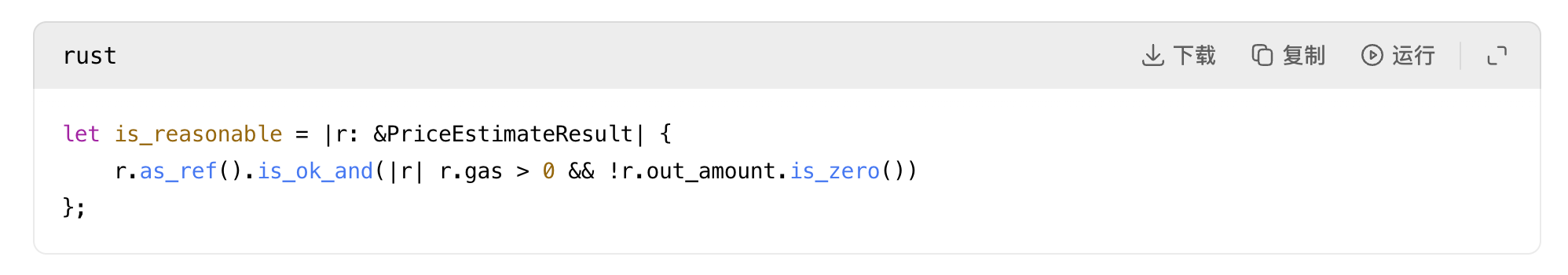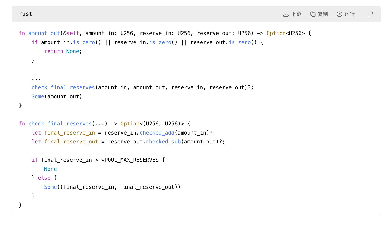 该段代码不会判断流动性池体量是否足以承接对应路由交易,仅判断交换操作在数学上是否有效。因此,即便一个仅储备 331 枚 AAVE 的微型池,也会被判定为承接 17957 枚 WETH 买入请求的有效场所,只因恒定乘积算法能算出非零结果,却完全无视这个结果会带来毁灭性的资产损耗。