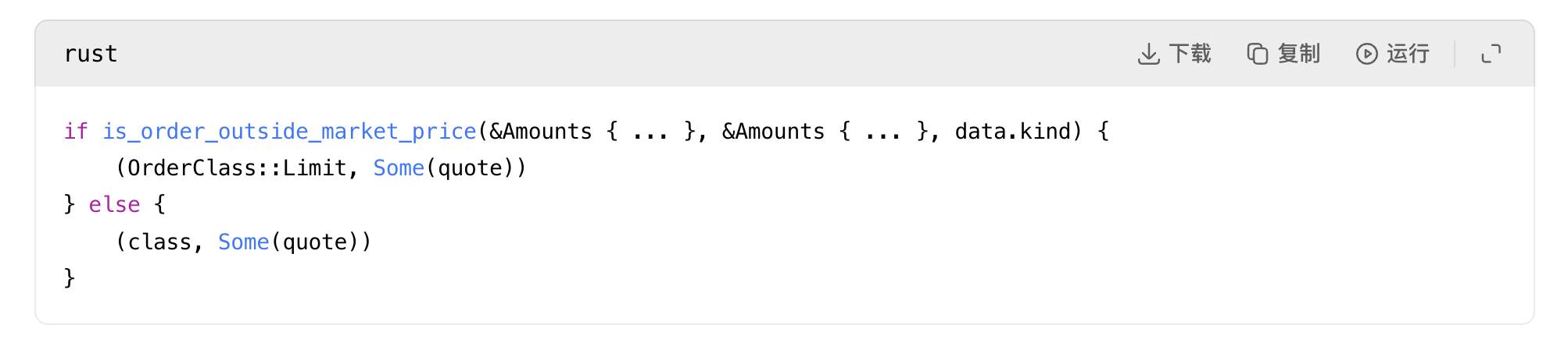 即使是 CoW 的订单验证逻辑在这里也 没有真正保护用户 ,因为它只检查订单是否超出报价时的市场价格,而不检查报价本身相对于实际流动性是否荒谬。