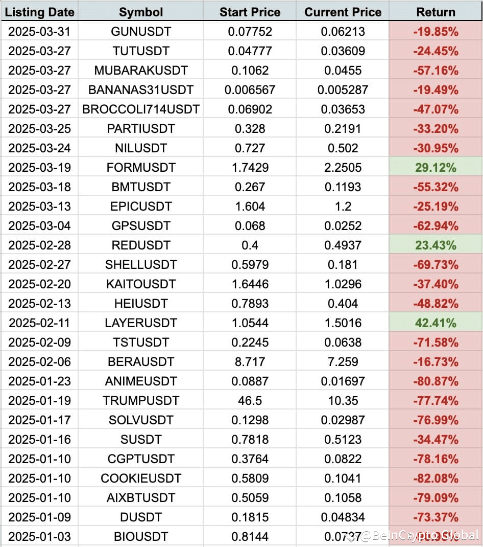 2025年揭示了一个残酷的现实。大多数在币安现货上线的代币都难以维持其价值。