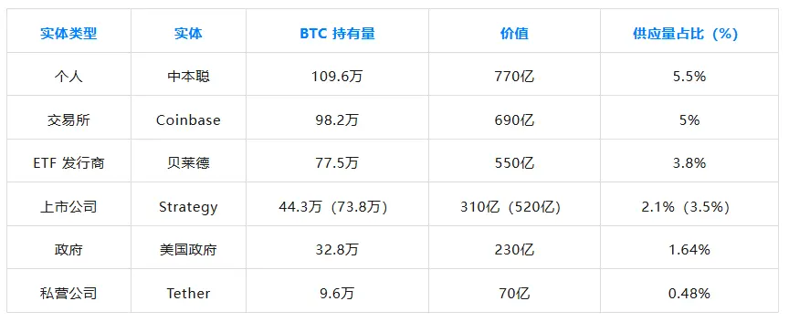 以下是来自各个主要实体类别(个人、交易所、ETF 发行 、政府 机构 、上市公司和私营公司)的顶级 比特币 持有者