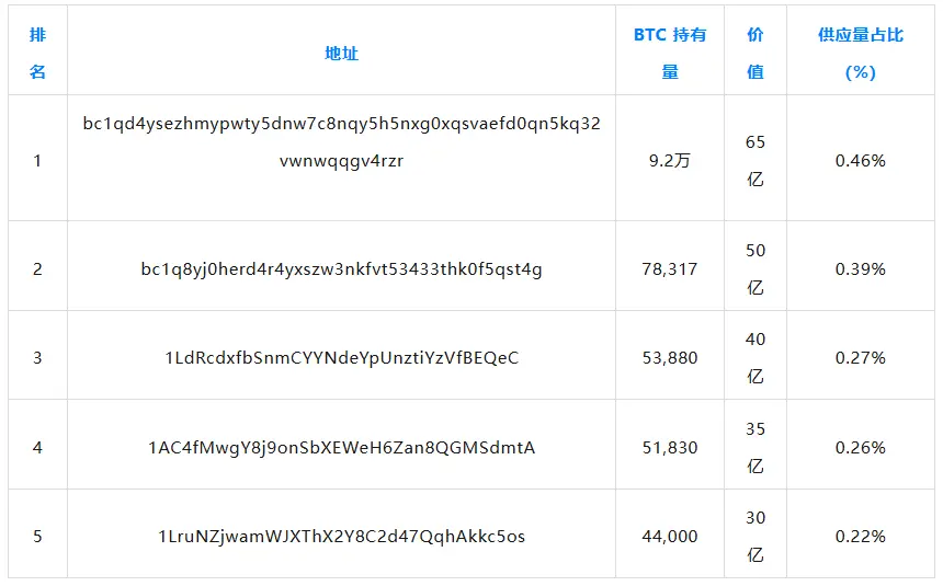 然而,也可以查看单个钱包,而无需将其归类到相应的实体中。下表列出了最大的单个钱包。前四名均为由全球最大交易所控制的冷钱包。