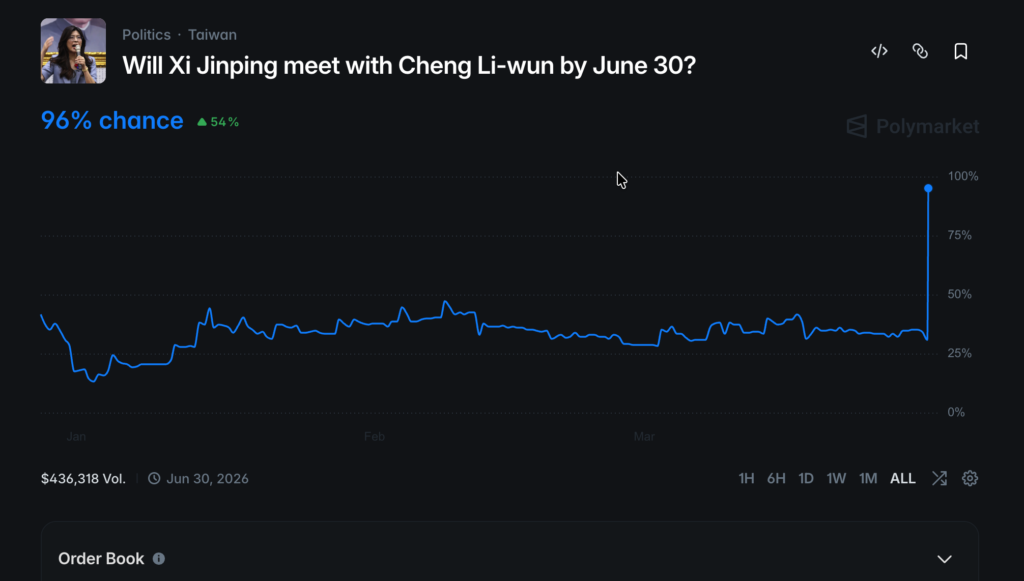 麗文今日確定四月訪中,Polymarket 的賠率計算機幾乎立刻轉向。3 月 30 日,國民黨宣布中共中央與習近平總書記邀請黨主席鄭麗文率團訪問中國,行程定為 4 月 7 日至 12 日。市場上掛著一個問題:「Will Xi Jinping meet with Cheng Li-wun by June 30?」——原本回答 Yes 的機率徘徊在 38%,訊息公開後數小時內跳升至 96%。