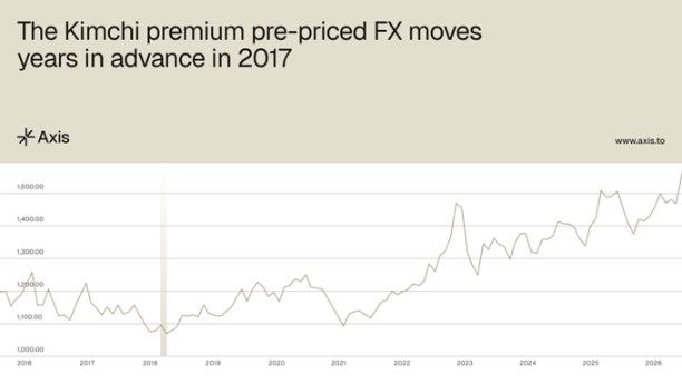 历史记录清晰地说明了这一点。早在 2017 年,当美元兑韩元汇率约为 1060 时,泡菜溢价曾达到约 40% 的峰值,这意味着有效的 USDT 兑韩元汇率约为 1480。随后在 2024 年 12 月,实际美元兑韩元汇率突破了 1480。泡菜溢价早在数年前就已提前定价了这一次外汇变动,这些信息编码在公开可见的数据中,但需要结合韩国市场资讯流才能正确解读。