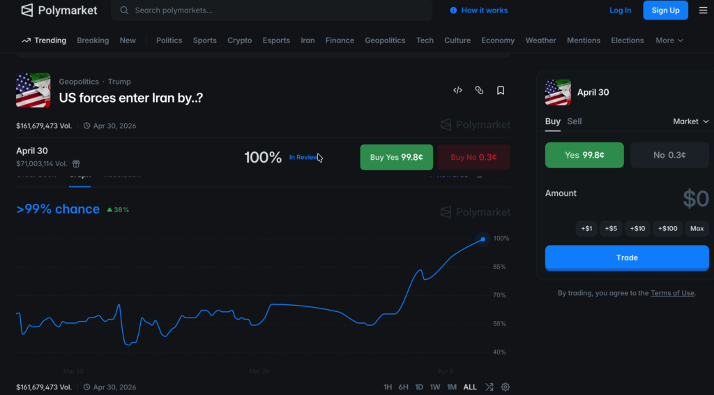 2 億美元,押在同一個問題上:美軍會在4月進入伊朗嗎? Polymarket「4月美軍進入伊朗」合約 ,4月5日盤中從61%直衝99%,單日暴漲35個百分點。Kalshi與Polymarket伊朗相關合約總交易量突破2億美元,創下地緣衝突題材新高。這不只是投機行為——預測市場的定價,正在比任何媒體更早讀出戰爭的溫度計。