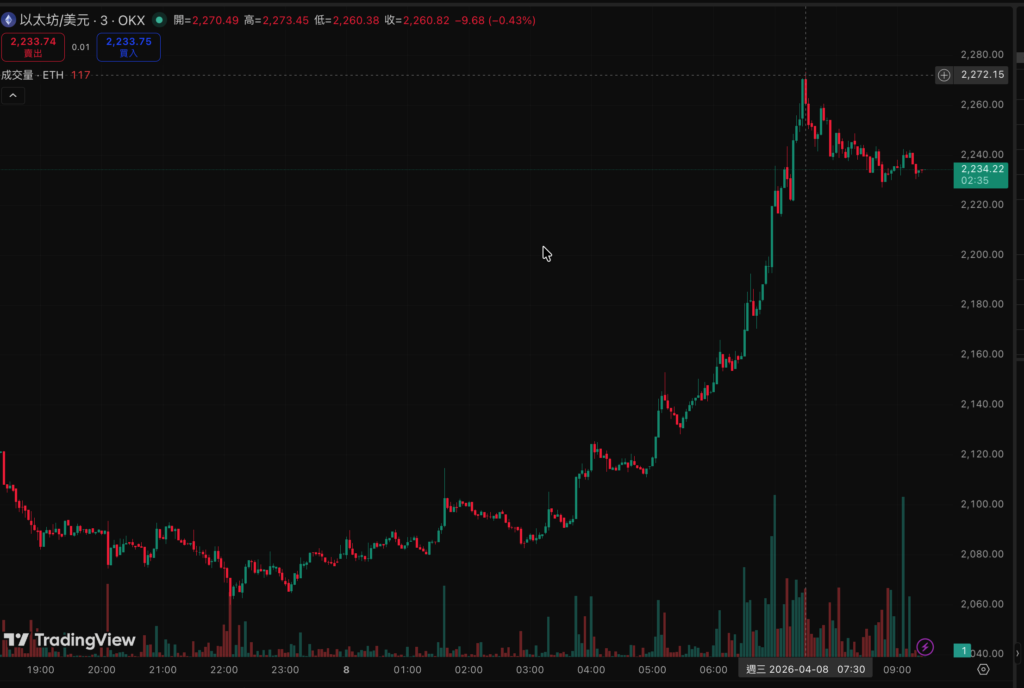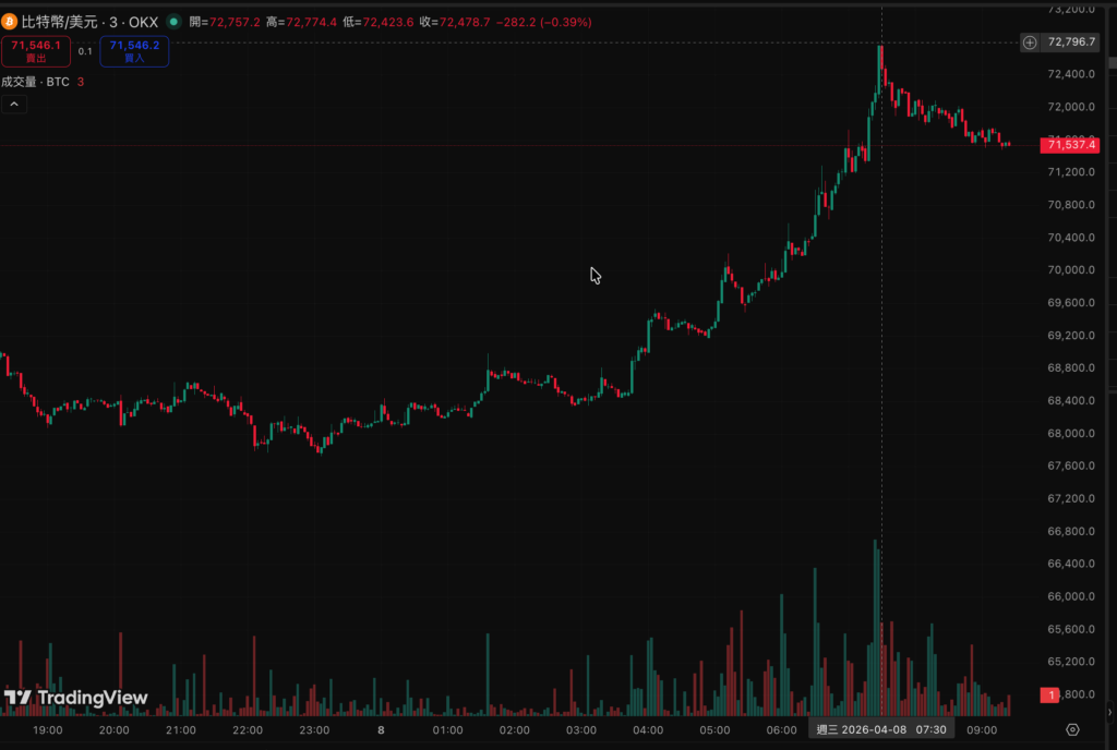 空 軍以為昨天 $65,000 是可以做空的位置,結果被抬著出場。BTC 在 4 月 7 日一度跌至約 $65,000 低點,隨後猛力反彈最高 $72,700,截至今(8)日台灣時間 09:15,現報 $71,701,24 小時上漲 4.54%,市值回升至 $1.43 兆美元;ETH 同步飆升至 $2,240.82,漲幅 6.35%,市值 $2,703 億,24 小時交易量達 $232 億。本波反彈幅度從低點計算已逾 10%,多頭氣勢相當猛烈。