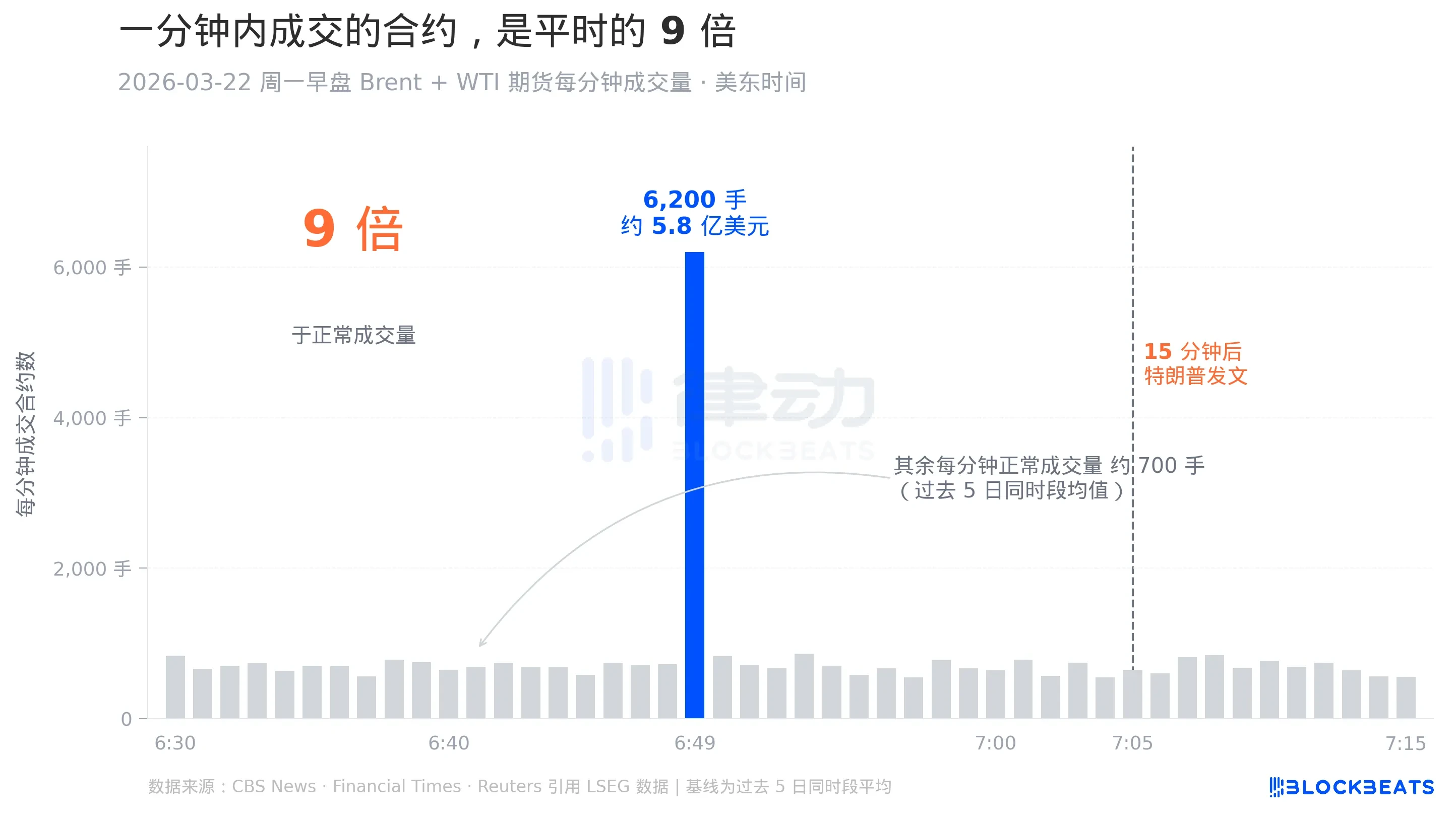 把 3 月 22 日那分钟的异常放大看,对比更直观。据 CBS 引用的 LSEG 成交明细,前后五天同一时段每分钟的正常成交量大约是 700 手。那一分钟成交了 6,200 手,差不多是平时的 9 倍。图里那根蓝色长条,就是那一分钟。前后其他的灰色柱子是同一小时的其他分钟,密密麻麻地贴在底部。
