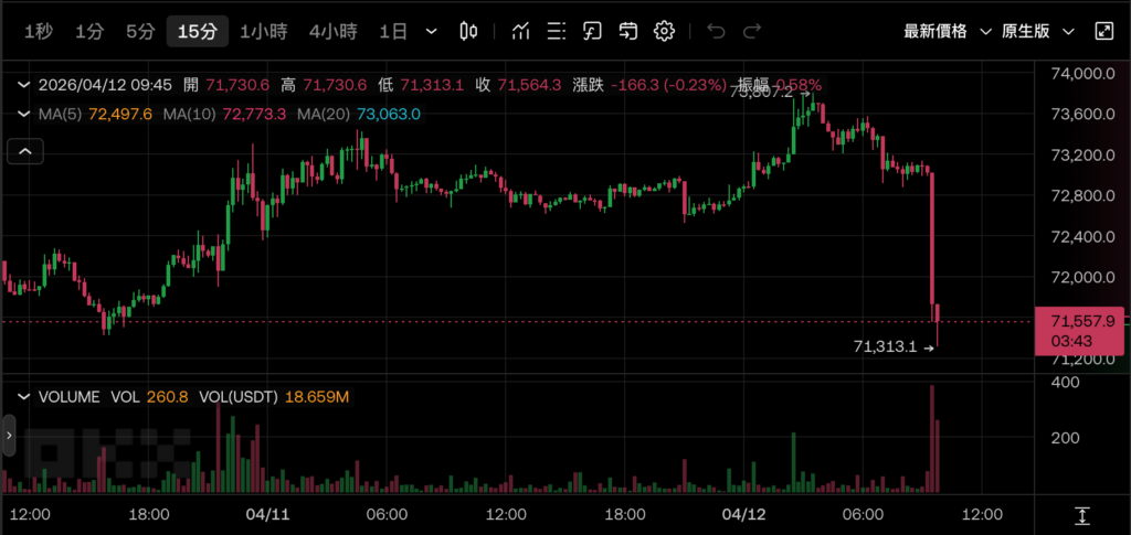 但是在稍早 09:30 左右,比特幣突然快速往下砸一根,最低插針 71,313 美元,現報 71,557 美元,半小時內下跌超 2%。
