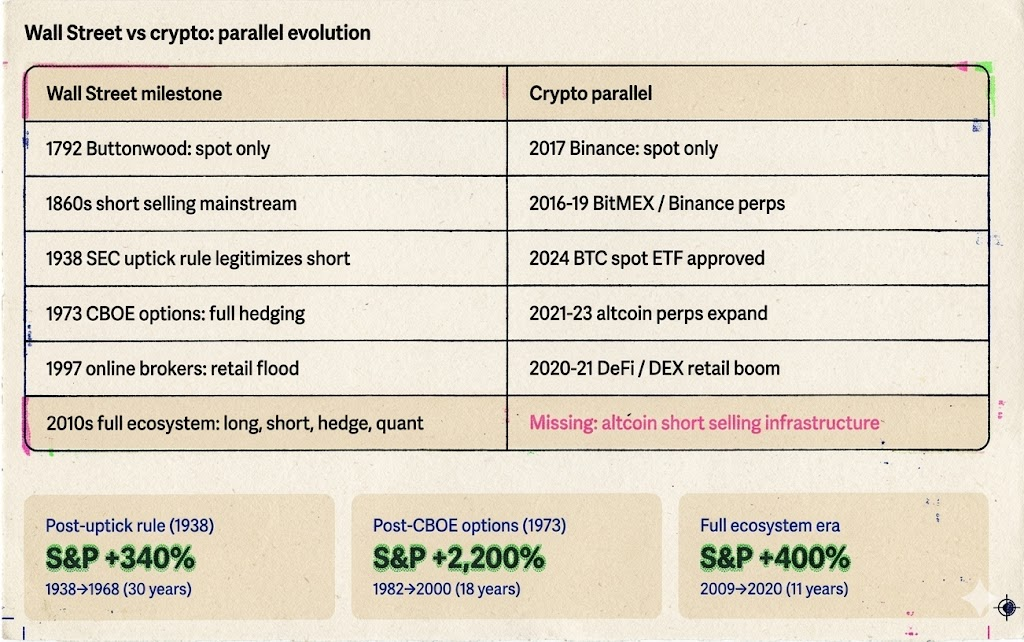 这和历史上每一次做空机制的诞生路径一致。1609年le Maire的做空不是阿姆斯特丹交易所批准的。1850年代华尔街的融券做空不是NYSE设计的。它们都是市场参与者自发创造的——先有工具,后有规则。SEC在1938年做的事不是发明做空,而是给已经运行了近百年的做空行为建立规则框架。