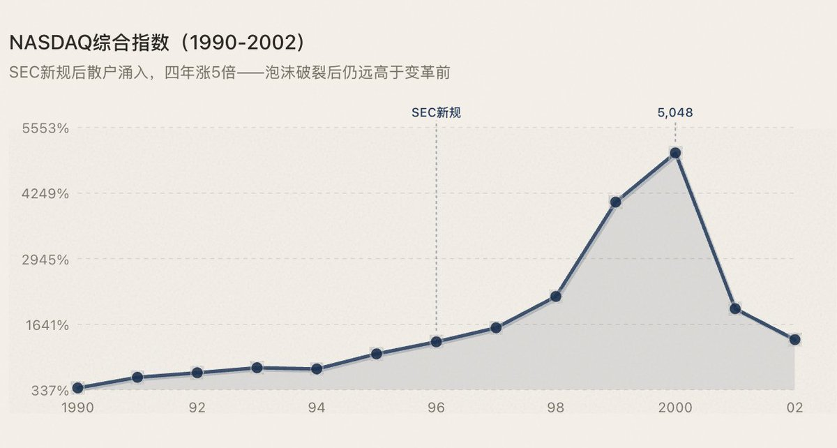 NASDAQ从1971年成立起就是电子交易所——人类历史上第一个。真正在1996-1997年发生的变革是两件事:SEC的Order Handling Rules打破了做市商对报价的垄断;在线券商(E*Trade、Ameritrade)把交易佣金从50-100美元压到了10美元以下。