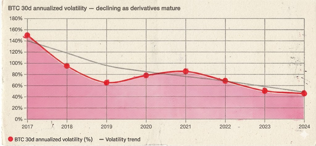 1860年代做空普及后,NYSE交易量十年增长十倍,华尔街从小圈子变成真正的资本市场。1938年uptick rule合法化做空后,机构资金大规模入场,S&P 500在随后30年里上涨340%。1973年CBOE期权诞生后,期权交易量50年增长10000倍,美股迎来数十年的持续扩张。2019年BTC永续合约上线后,BTC波动率从150%降到50%,市值却从100亿美元膨胀到2万亿。