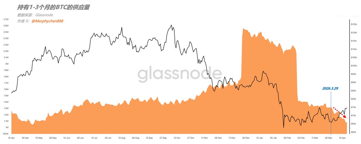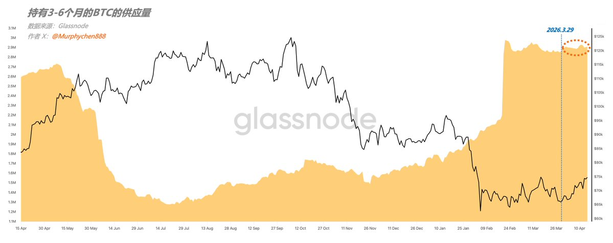 再看图3,持有3-6个月的BTC供应量中,在3月29日之后并没有明显增多。那就证明是情况2,即1-3个月的BTC在反弹中被卖了,目前还有109万枚。
