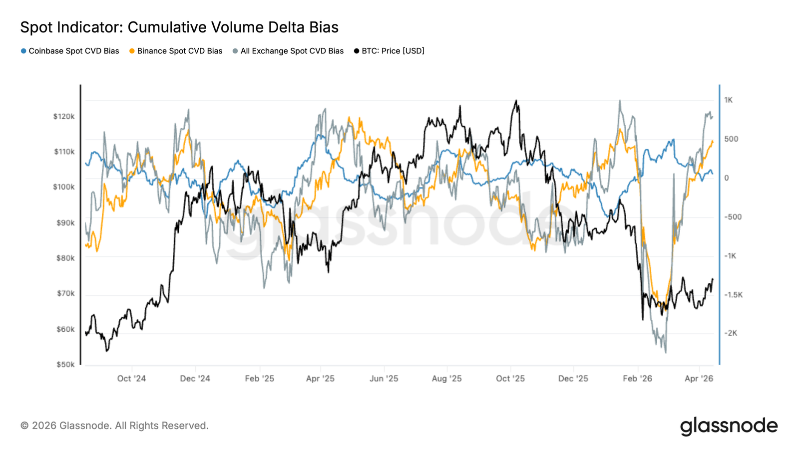 在 2 月的投降事件之后,现货累计成交量差值急剧反弹,总体资金流从深度负值区间回升至正值区域。这一转变标志着市场由激进的卖方压力向净现货积累的明显过渡,与近期价格企稳的走势相符。