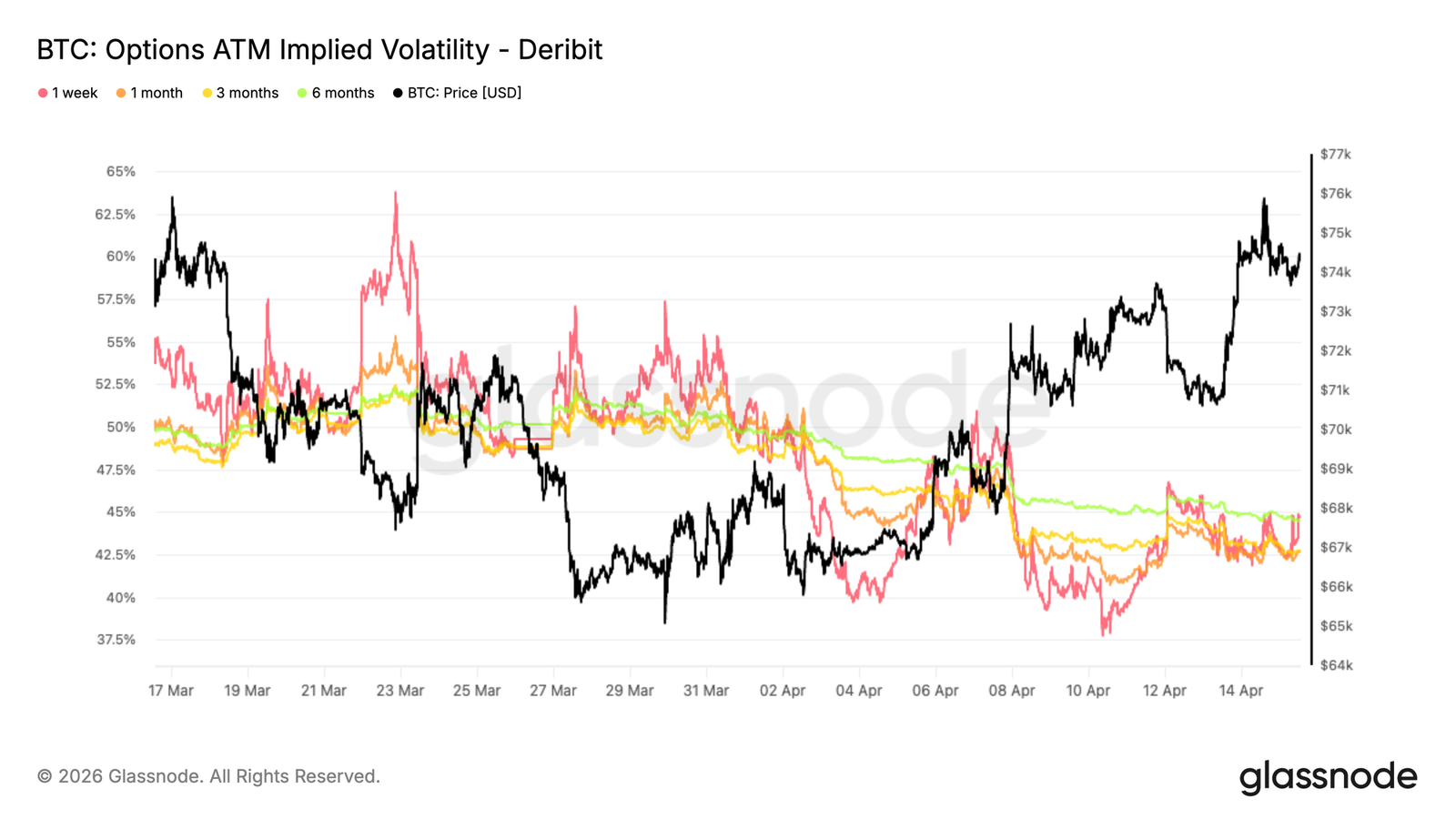 现货市场的反弹行情并未转化为波动率的有意义重定价,整条曲线上的隐含波动率均有所下降。近端合约已走软,较长期限合约价格亦已下调,指向波动率预期的广泛正常化。期限结构仍相对平坦,1 个月期波动率略低于 3 个月期,约为 42.6%,反映出市场对近期风险进行定价的紧迫感有限。这种压缩状态表明,近期的地缘政治头条已不再被视为持续动荡的催化剂。相反,波动率正被重新定价至更稳定的条件,尽管宏观不确定性仍未消除。各期限合约的同步下移表明,交易者正在解除保护头寸,而非增加新的敞口。