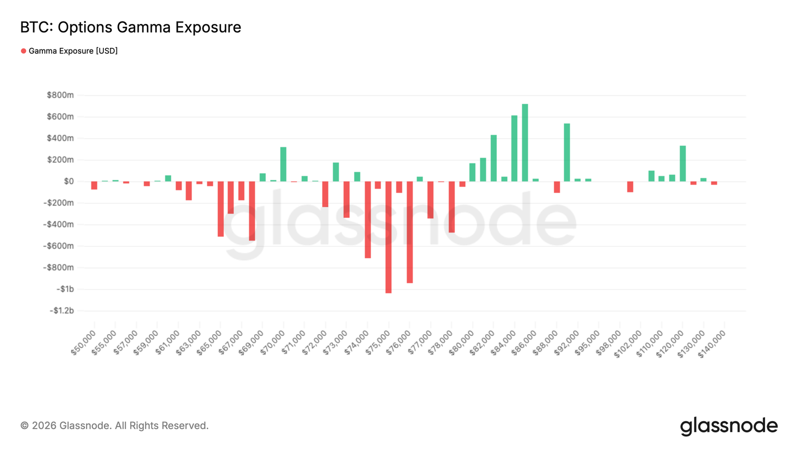从市场结构角度看,交易商头寸在近期价格走势中扮演着核心角色。大量负伽马敞口集中在 74,000 美元至 76,000 美元区间,约 30 亿美元的敞口位于现货价格上方,形成了一个套期保值操作可影响价格方向的区域。