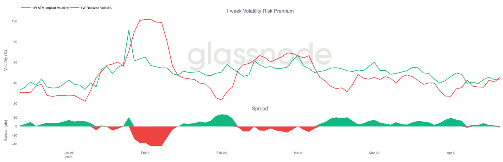 这一转变发生在周初现货价格大幅波动的背景下,当时比特币单日涨幅超过 5%,而隐含波动率却被定价在较低水平。结果,期权市场低估了实际价格波动的幅度,导致风险溢价出现倒挂。