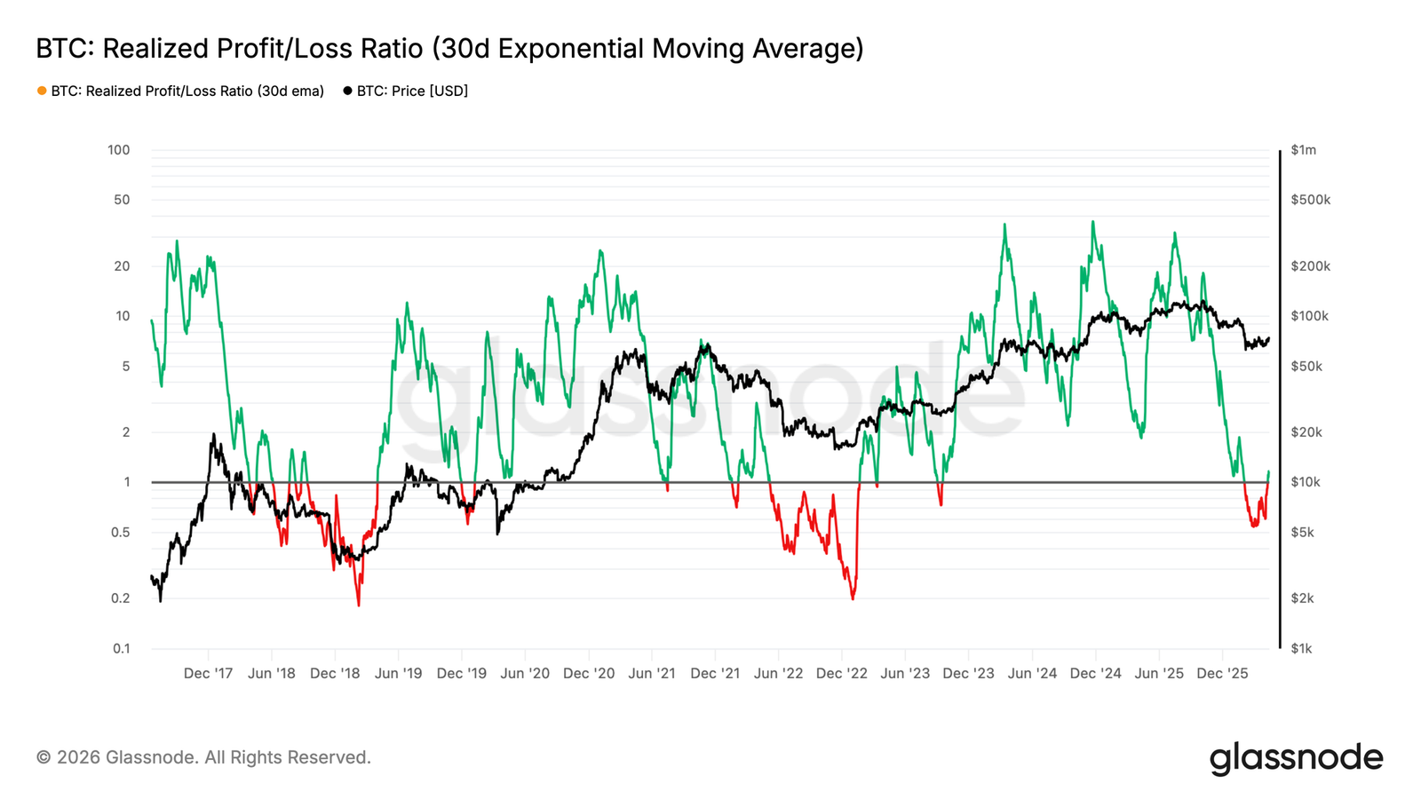 在上述短期衰竭信号的基础上,要对市场动能进行更长期的评估,就需要考察更广泛投资者群体中盈利与亏损实现之间的平衡关系。已实现盈亏比衡量的是链上每兑现 1 美元亏损所对应实现的盈利美元价值,其 30 日指数移动平均线则用于平滑短期噪声以揭示潜在趋势。