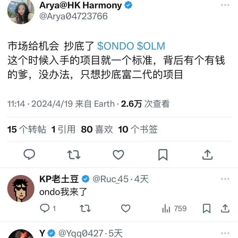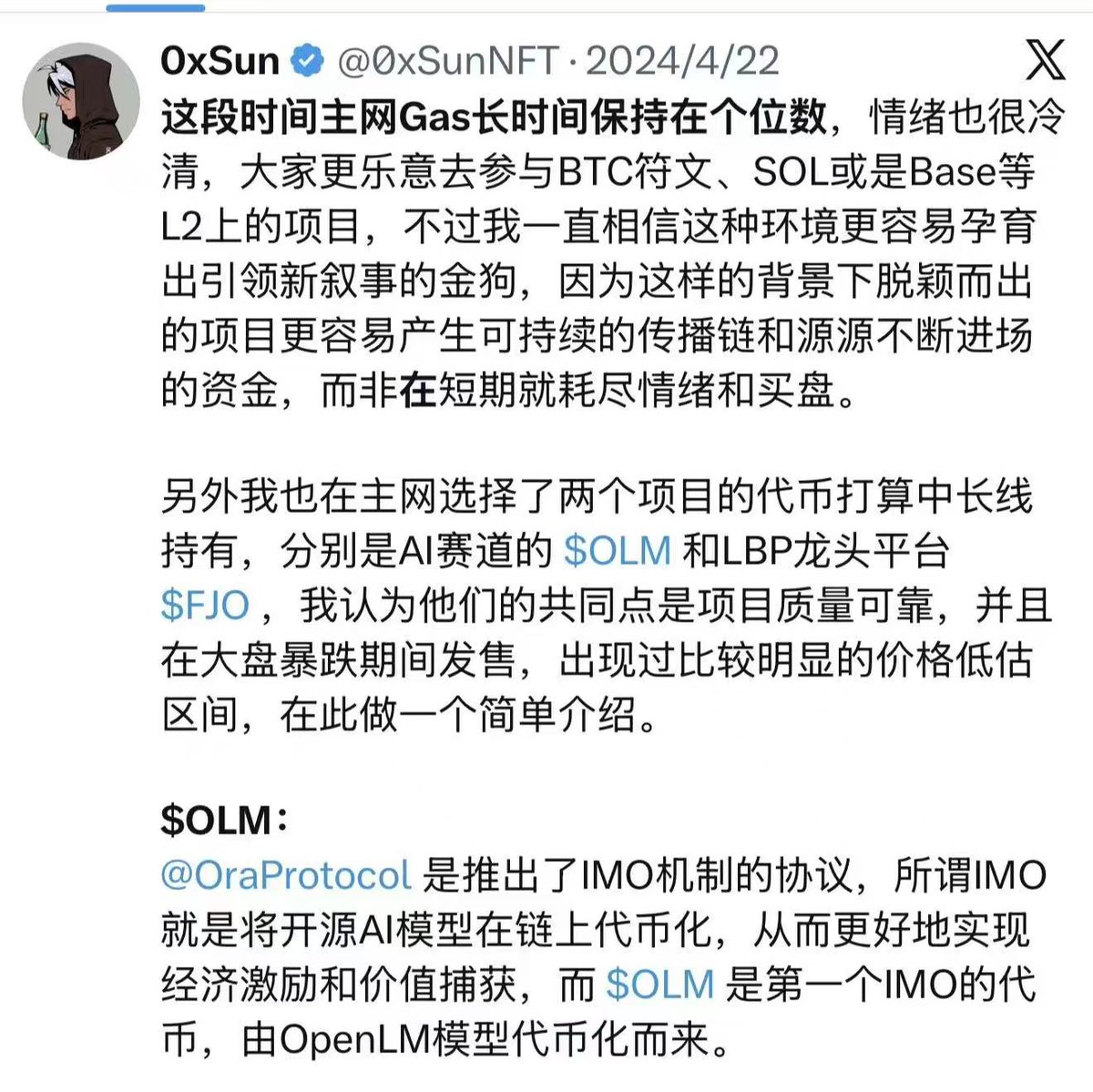 我找到了2个,一个是羊姐社区 @Arya_web3 ,一个是被大家称为链上皇的 @0xSunNFT ,我后来跟羊姐熟了后一直在社群建设OLM这个项目。Sun哥后来也是一直关注着,奈何那时候他的群是收费的没有进,也是后来看着他在 $TRUMP 上拿到了A9大的结果,除了上面两位还有后来看到有发这个项目信息的,一个是剑哥@jason_chen998 一个是土澳大师兄 @BroLeon 我记得剑哥有发ORA平台代币上线后参与项目线下会,土澳哥好像参与了IMO打新,都是非常值得关注的T0级信息KOL。