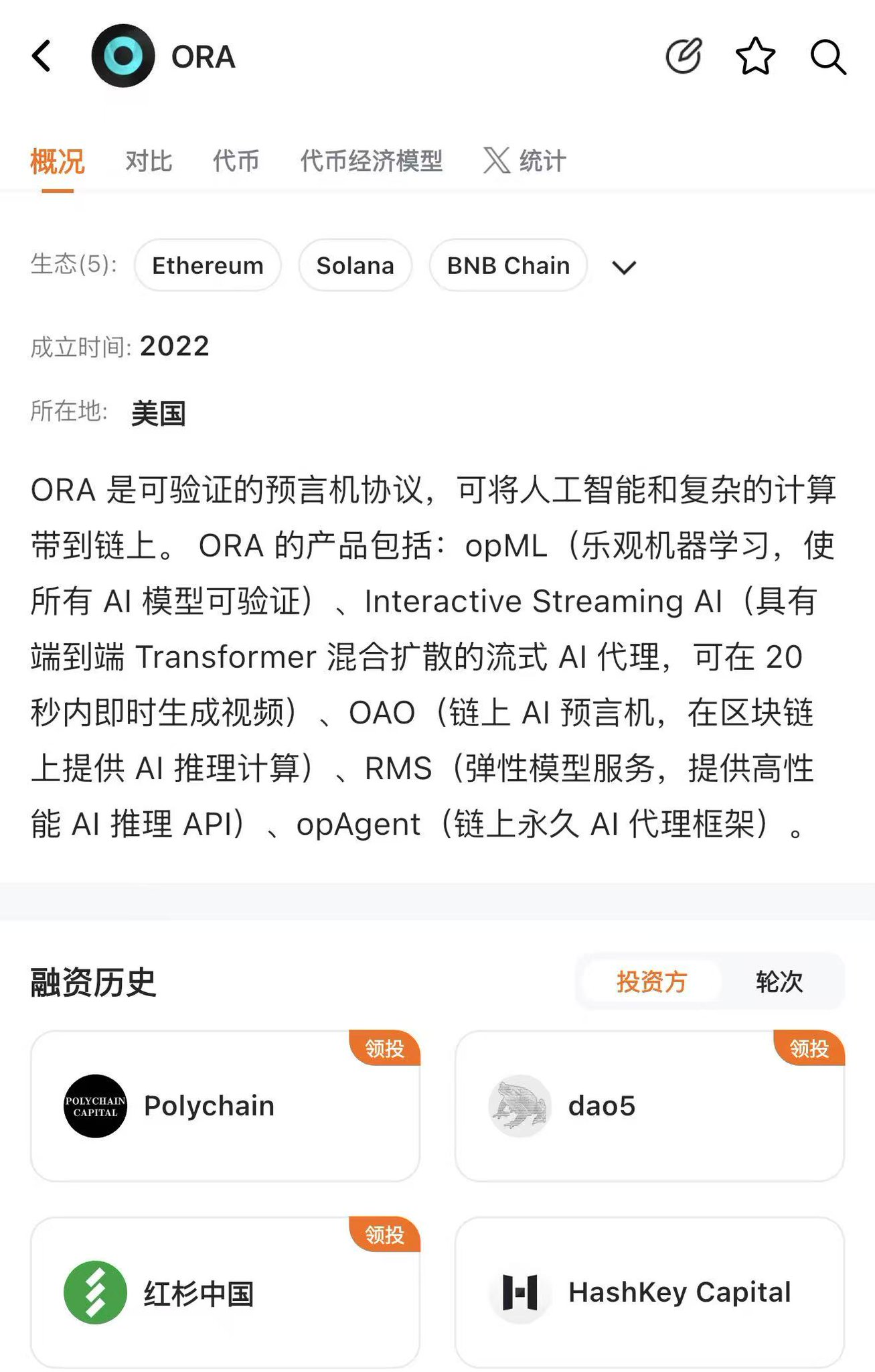 Ora 这个项目我们接触的时候只有红杉中国投了300万,后来才有的Polychain 投的2000万。Ora 之前是另外一个名字,没做起来改了新名字做Ai预言机赛道的,有印象的小伙伴都知道后来Ai赛道火了,特别是有一个大家都知道的Virtuals,我接触Virtuals 的时候这个项目还没有发币,还有蹭Ora的合作流量的。