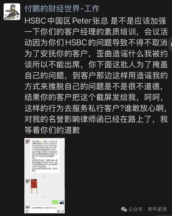 坊间出现了一个说法,称他因被监管约谈导致活动取消。付鹏公开回应,直接炮轰汇丰,晒出聊天记录,称“律师函已经在路上,等着你们的道歉"。