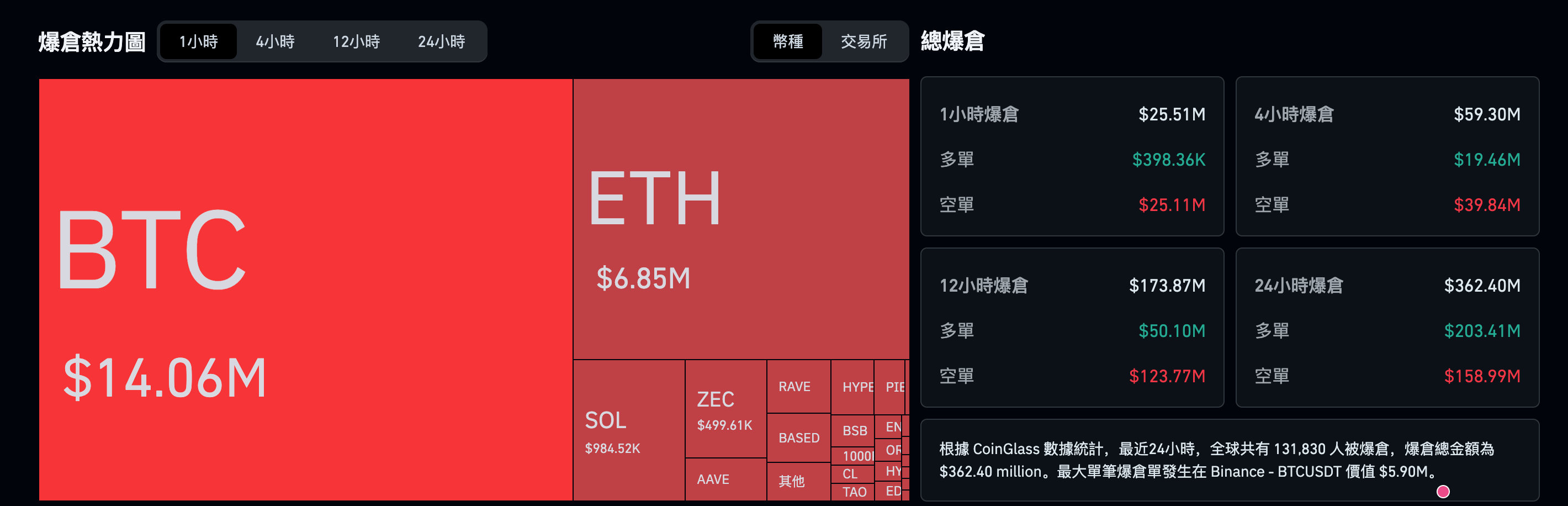 根據區塊鏈數據分析平台 CoinGlass 的最新統計數據,在過去的 24 小時內,加密貨幣全網共有 131,983 名交易者 遭到爆倉清算。這波劇烈震盪導致的爆倉總金額高達 3.6026 億美元 (約合新台幣 117 億元),顯示出市場在關鍵點位突破時的強大殺傷力。