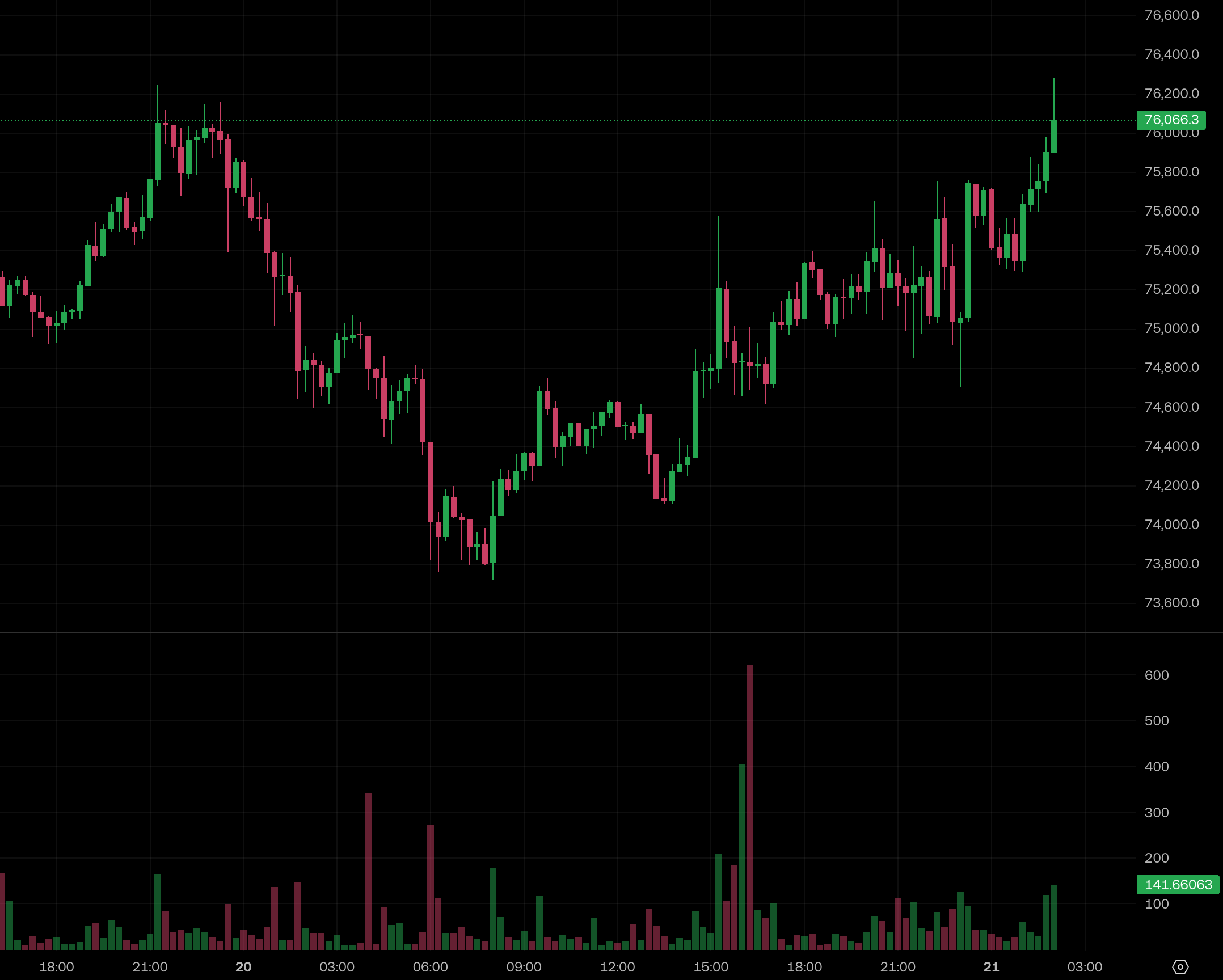 台灣時間 4 月 21 日凌晨 2 點左右,大盤迎來一波強勁的上漲動能。 比特幣(BTC) 價格短線突破 76,000 美元 整數大關;與此同時, 以太坊(ETH) 也緊隨其後,成功站上 2,300 美元 的關鍵水位。