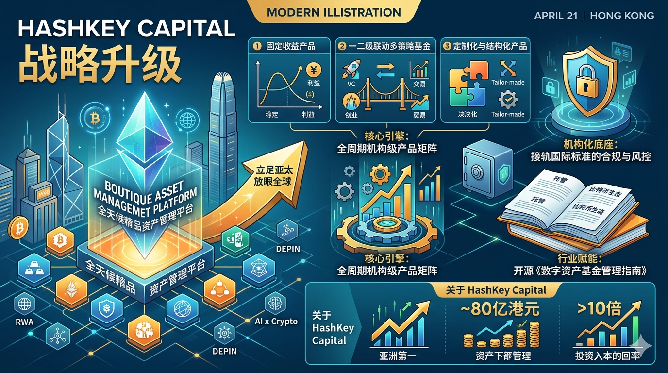 Hong Kong, April 21 —— 数字资产金融服务集团 HashKey Group 旗下 HashKey Capital 今日宣布进行全面战略升级,正式构建全天候精品资产管理平台(Boutique Asset Management Platform)。平台全面拓展资产配置边界,目标从纯代币投资延伸至股权、债券及衍生品,构建涵盖一二级市场、固定收益、定制化服务及真实世界资产(RWA)的生态系统。