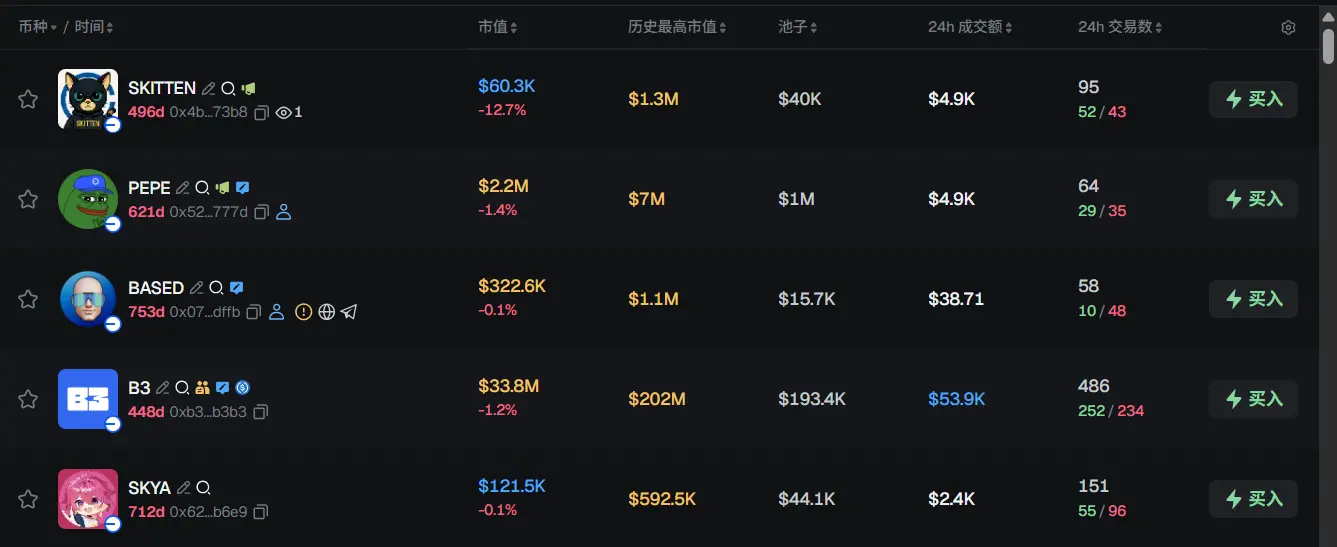 过去 24h Base 热门代币前五依次为:SKITTEN、PEPE、BASED、B3、SKYA