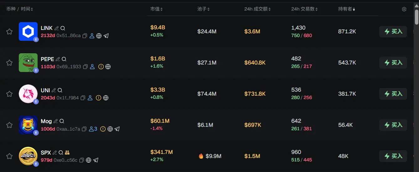 过去 24h ETH 热门代币前五依次为:LINK、PEPE、UNI、Mog、SPX
