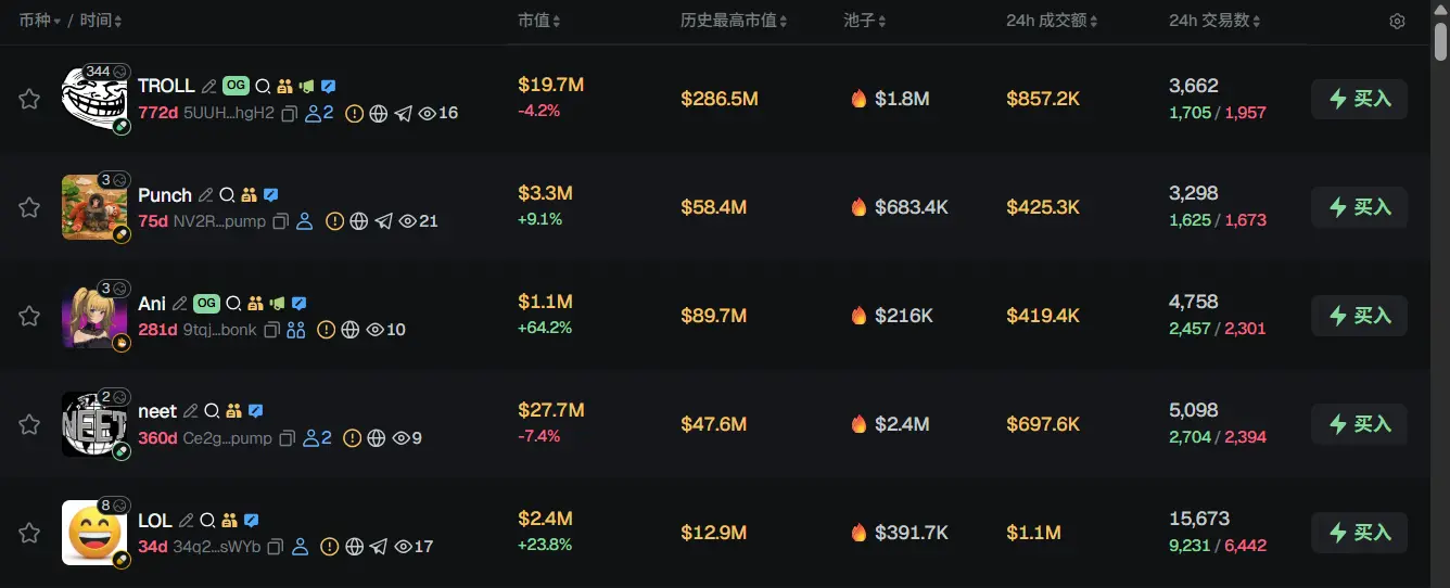 过去 24h Solana 热门代币前五依次为:TROLL、Punch、Ani、neet、LOL