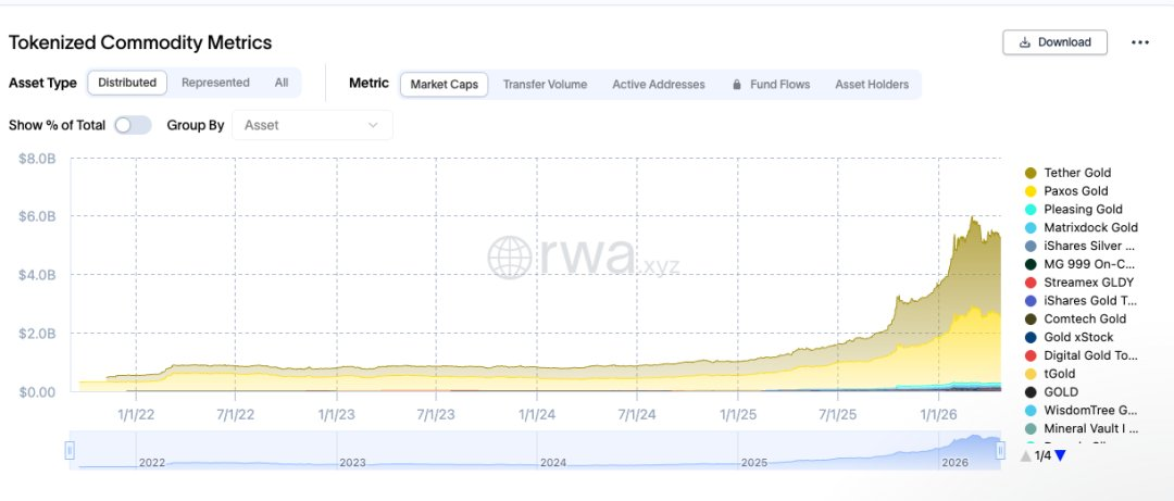 rwa.xyz 对代币化商品资产的规模统计,其中大部分是代币化黄金